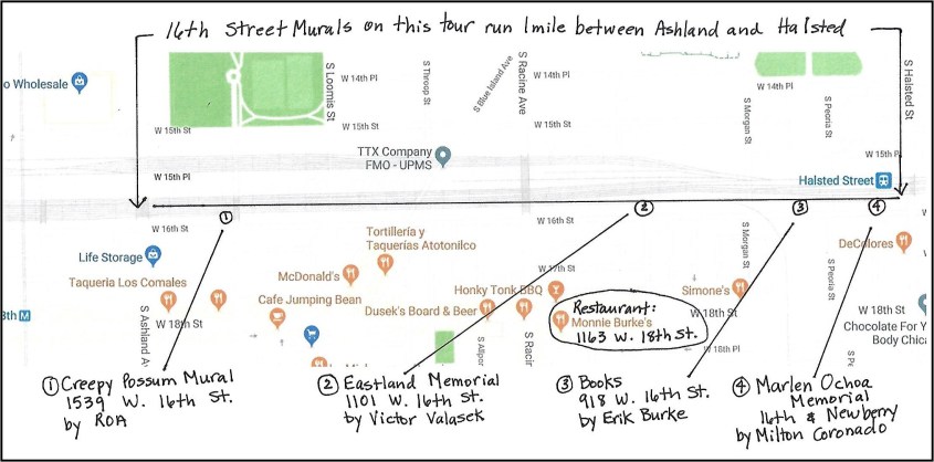 This is a one mile stretch to meander. You can drive, stop and look closer as different paintings catch your eye. It is easy to pull over and park along the side of the road as you drive down it. If you are really organized, you can Google “16th Street Murals Pilsen” or “Pilsen Murals” and find an abundance of articles and videos about the murals, their history and information about the artists. I included the location of some of our favorites on the map.