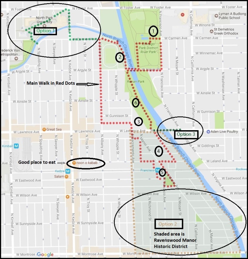Ed’s Comments: These two walks, so near each other, are a wonderful way to experience the contrast of different Chicago neighborhoods. Sauganash is a charming, suburban-like old neighborhood with interesting, well maintained homes and a historic parish church. Not much has changed in 50 years and, in a sense, time has stood still for the visitor.