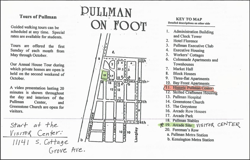 There are guided walking tours of Pullman on the first Sunday of every month from May to October. In addition, there is an Annual Historic Pullman House Tour weekend, where homes and sites in Pullman are open to the public. This is fabulous and gives you a chance to see inside some beautifully restored houses as well as the Florence Hotel and other historical sites. Highly recommended! However, if neither of those options fit with your schedule, you will still enjoy going to the Historic Pullman Foundation Visitor Center, browsing their exhibits and taking the self-guided walking tour with the map they provide. This map is reproduced here and makes up our walk for Pullman.