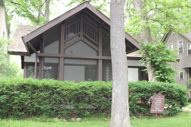 Described by the Chicago Daily Tribune as “a residence said to reach the zenith of modernism,” the house here was perhaps one of the earliest Art Deco small homes in the nation. Built by Herman Voss, the house features many typical Art Deco elements. Vertical lines are emphasized all along the front elevation, both in the long rectangular windows, and in the ornamental pilasters that frame two round windows. Decorative elements, such as the detailing at the corners of the wall below the roofline, add to the Art Deco feel of the house. (From the National Register of Historic Places Registration Form)