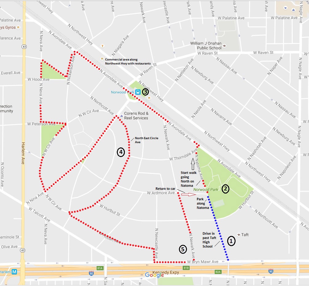 Do a quick drive by (red dotted line) of these two notable sites before starting the walking tour of the Jackson Park Highlands (where blue dotted line starts).