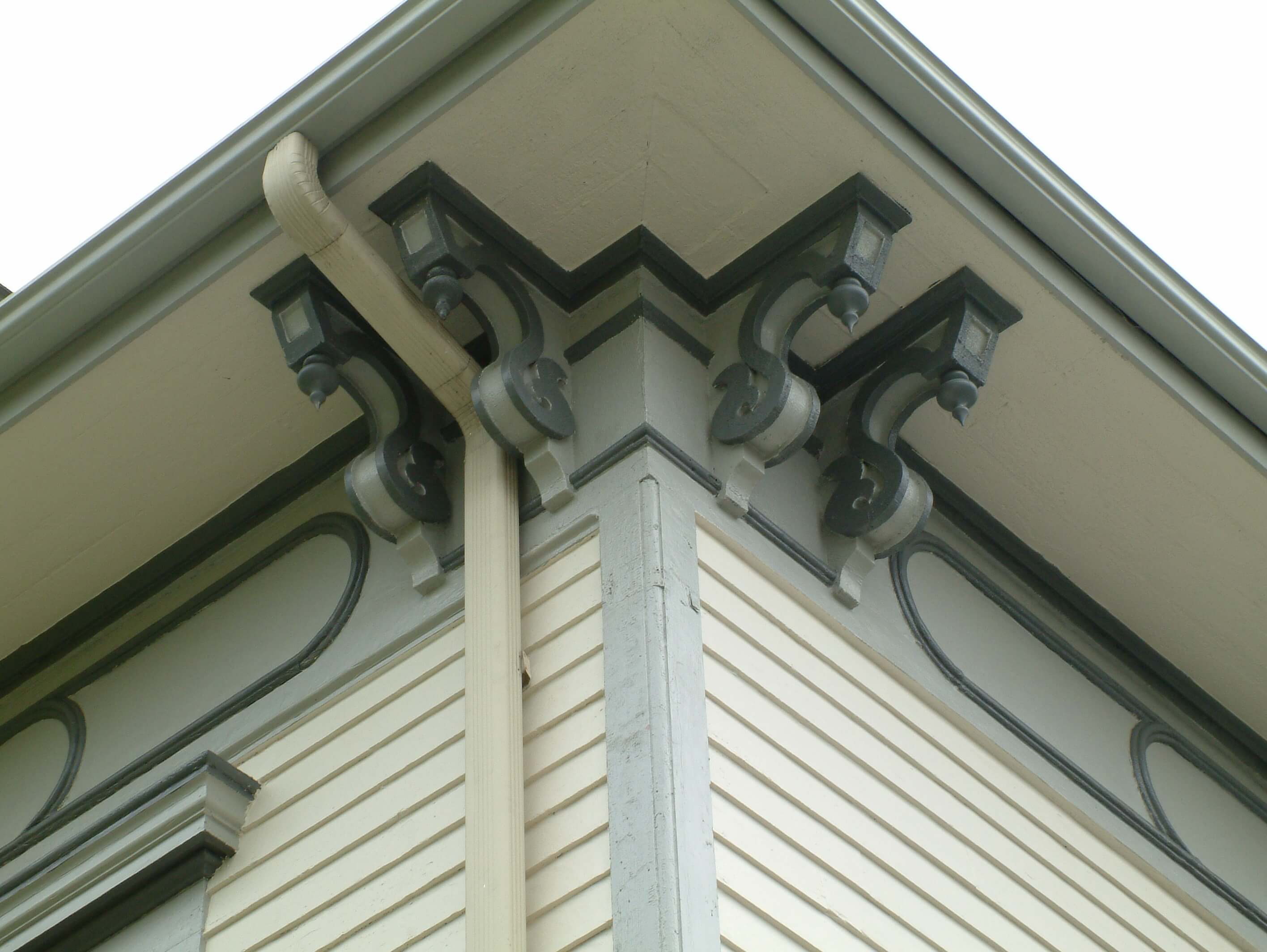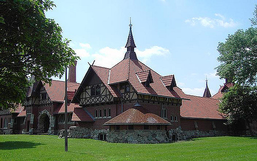 Among the unusual features of this eclectic house are brickwork that imitates half-timbering and terra-cotta plaques (more commonly found on commercial buildings) stuck like postage stamps on the piers.